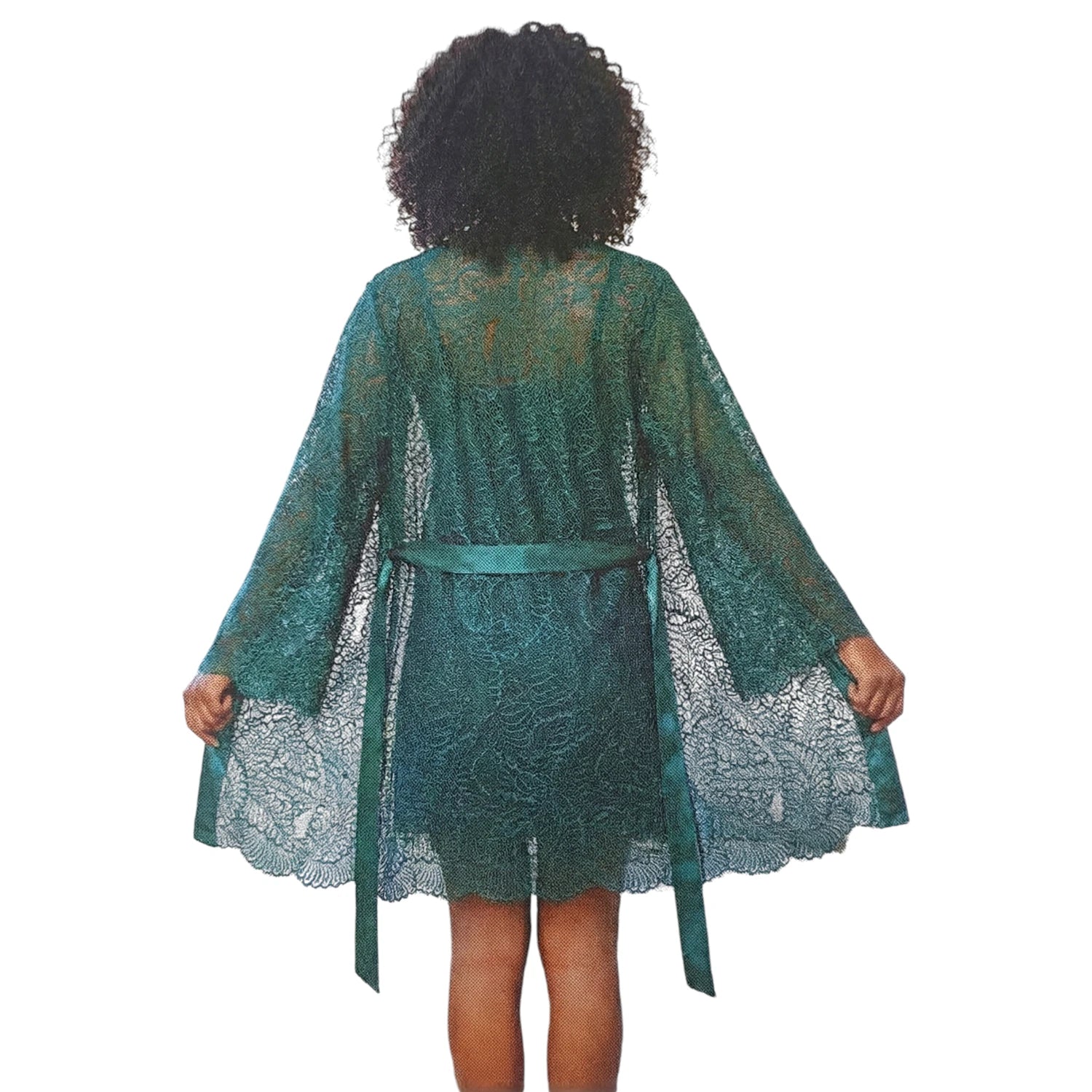Designed to blend sophisticated romance with a touch of mystery. Crafted from intricate floral lace with delicate scalloped edges, the set features a figure-skimming chemise with adjustable spaghetti straps and a plunging V-neckline. To complete the look, the matching sheer kimono robe drapes beautifully over the shoulders, cinching at the waist with a coordinating ribbon belt for a flattering silhouette. Paired with a matching minimalist G-string, this ensemble offers the perfect balance of coverage and allure for your most intimate moments or a luxurious night in.