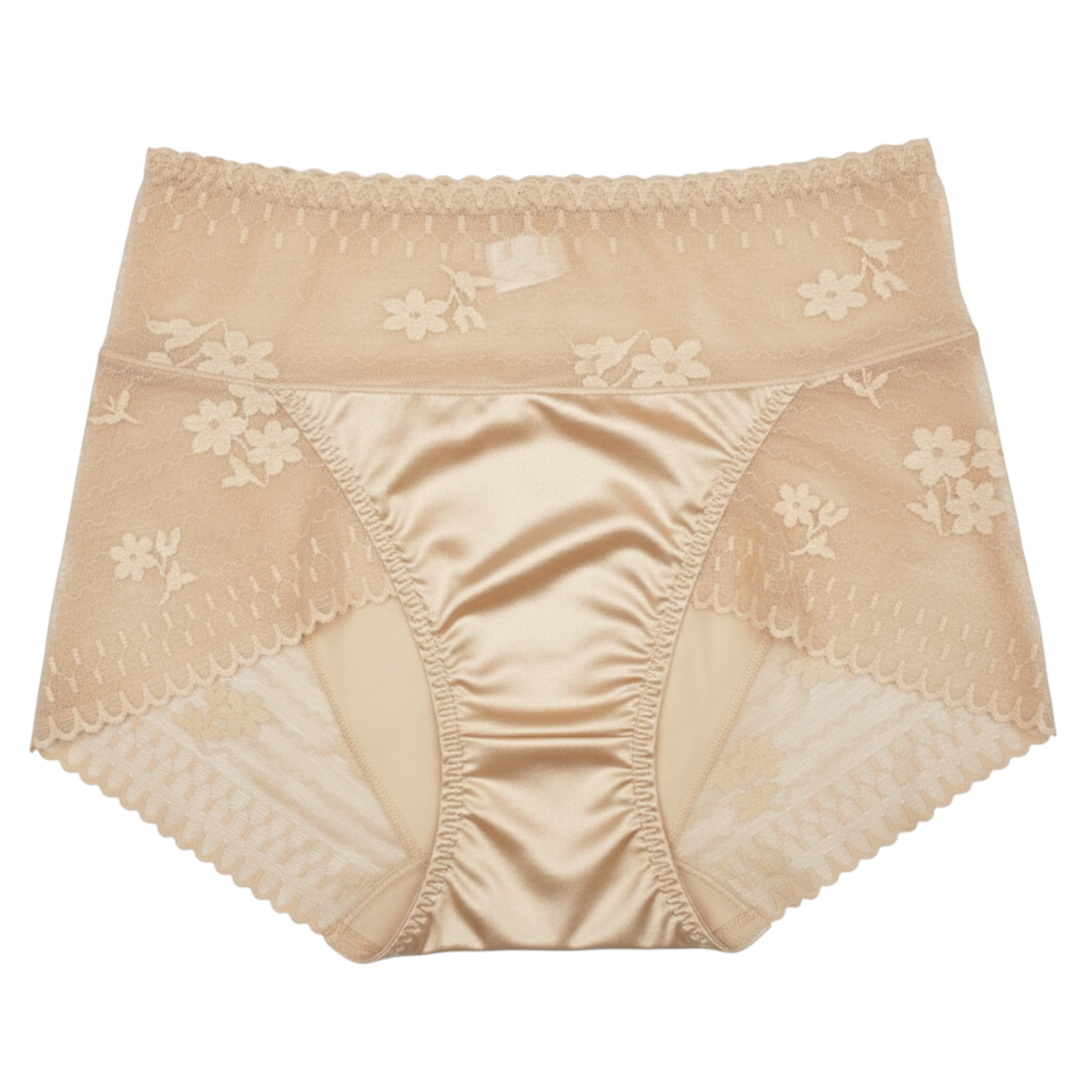 This high-waist brief is crafted for ultimate elegance and comfort. The centerpiece is a panel of toned satin that provides a silky, smooth feel against your skin. This is perfectly framed by a wide band of intricate floral filigree lace, offering a beautifully scalloped edge and gentle, supportive coverage. Designed to embrace your curves, the Elysia Brief is a luxurious foundation for every beautiful outfit.