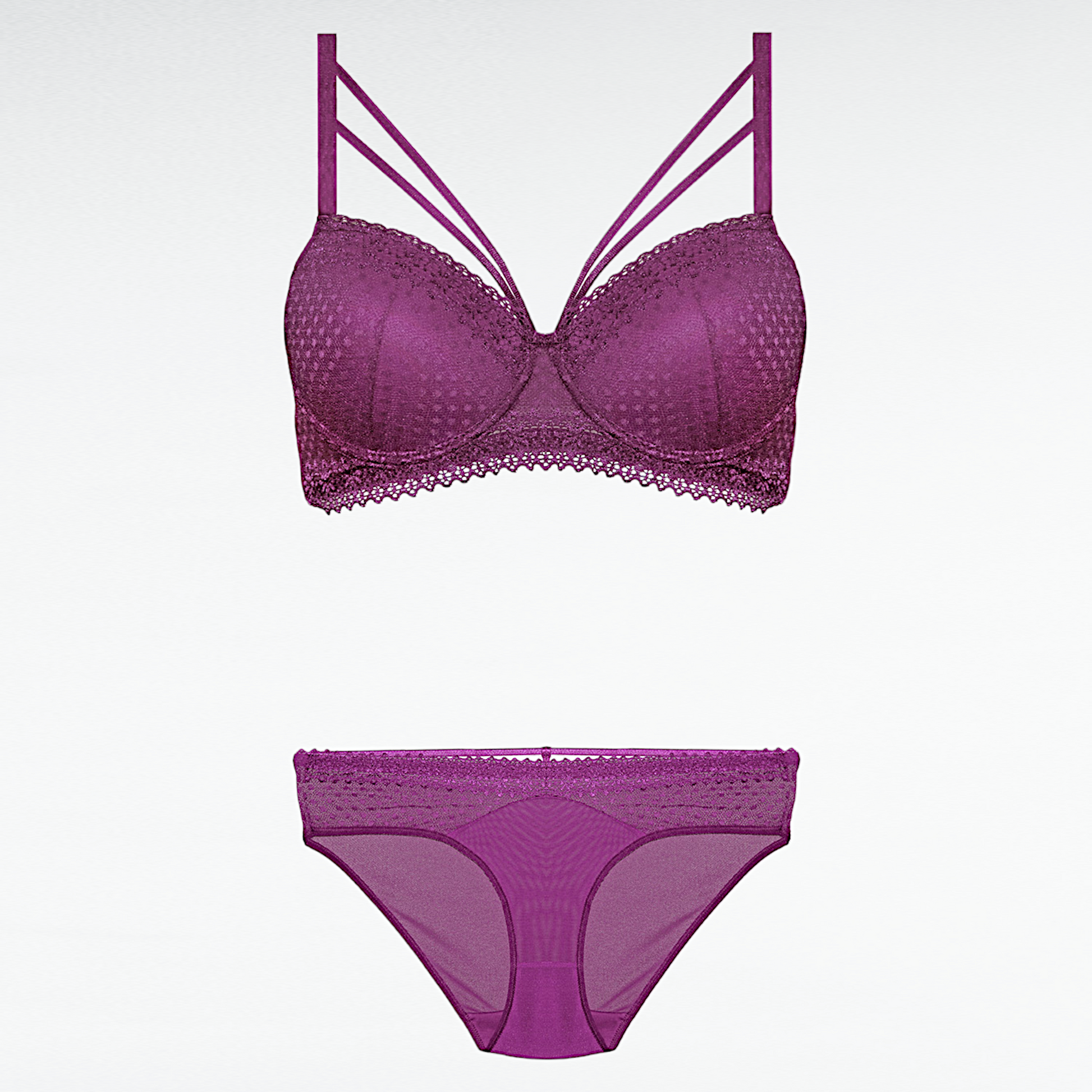 The perfect blend of elegance and allure: this chic bra and panty set features vibrant colors and sleek designs. With delicate lace detailing and a modern strappy accent, these bras provide both comfort and style. The matching panties boast a semi-sheer mesh that adds a touch of seduction while ensuring a comfortable fit. Available in striking shades of red, purple, and classic black, this set is ideal for adding a pop of color to your lingerie collection. Whether you’re dressing up for a special occasion or just want to feel confident every day, this set is the perfect choice for embracing your bold femininity.